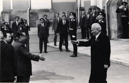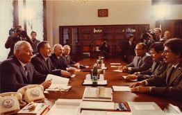 Визит в СССР короля Испании Хуана Карлоса Первого и и королевы Софии. 1984 Весна 1984 года. Торжественная встреча и проводы в аэропорту короля Хуана Карлоса I и королевы Софии. Встреча и переговоры в Кремле. Присутствуют: К. У. Черненко, Н. А. Тихонов, А. А. Громыко, министр иностранных дел Испании Моран и другие официальные лица СССР и Испании.
